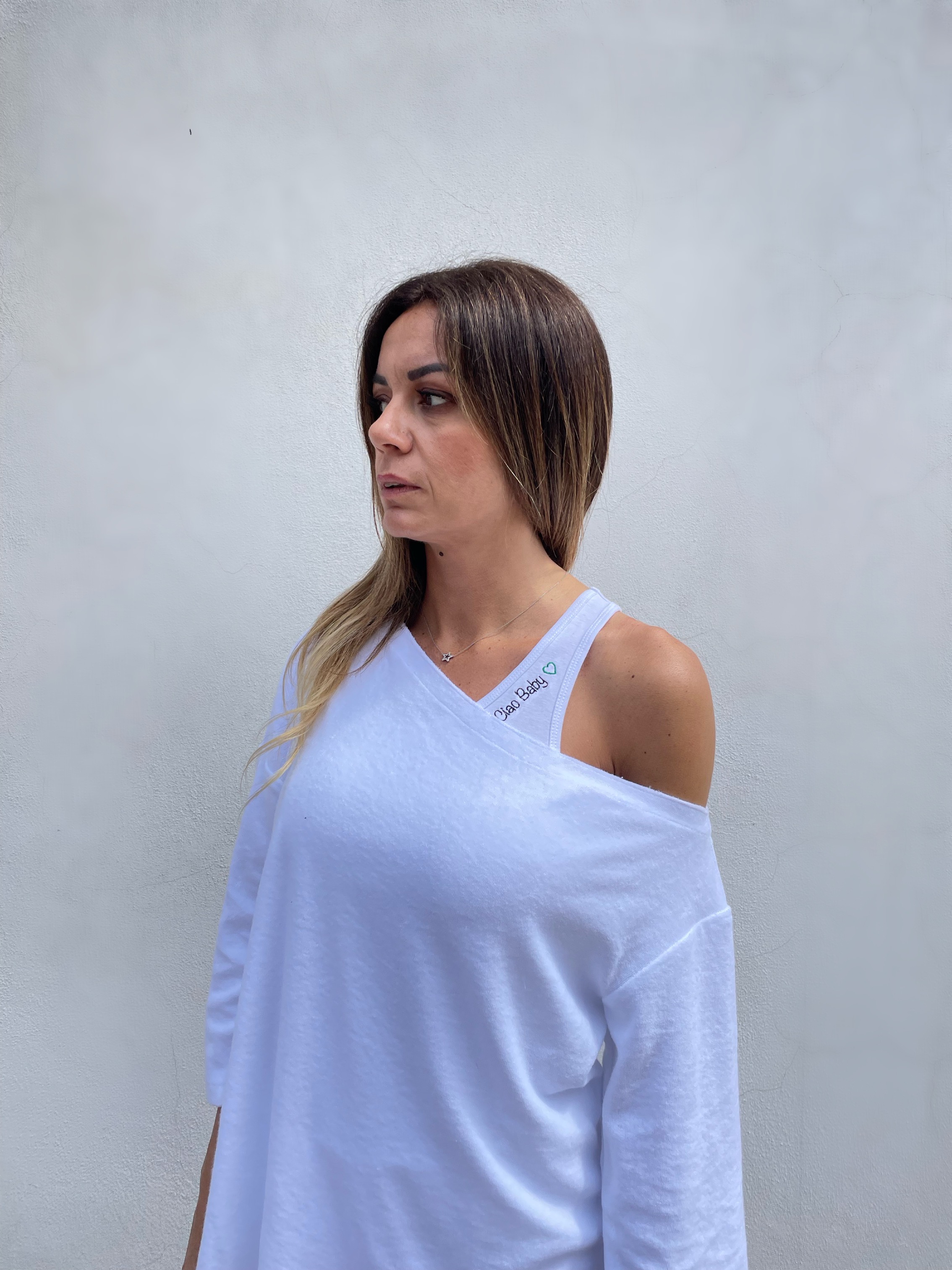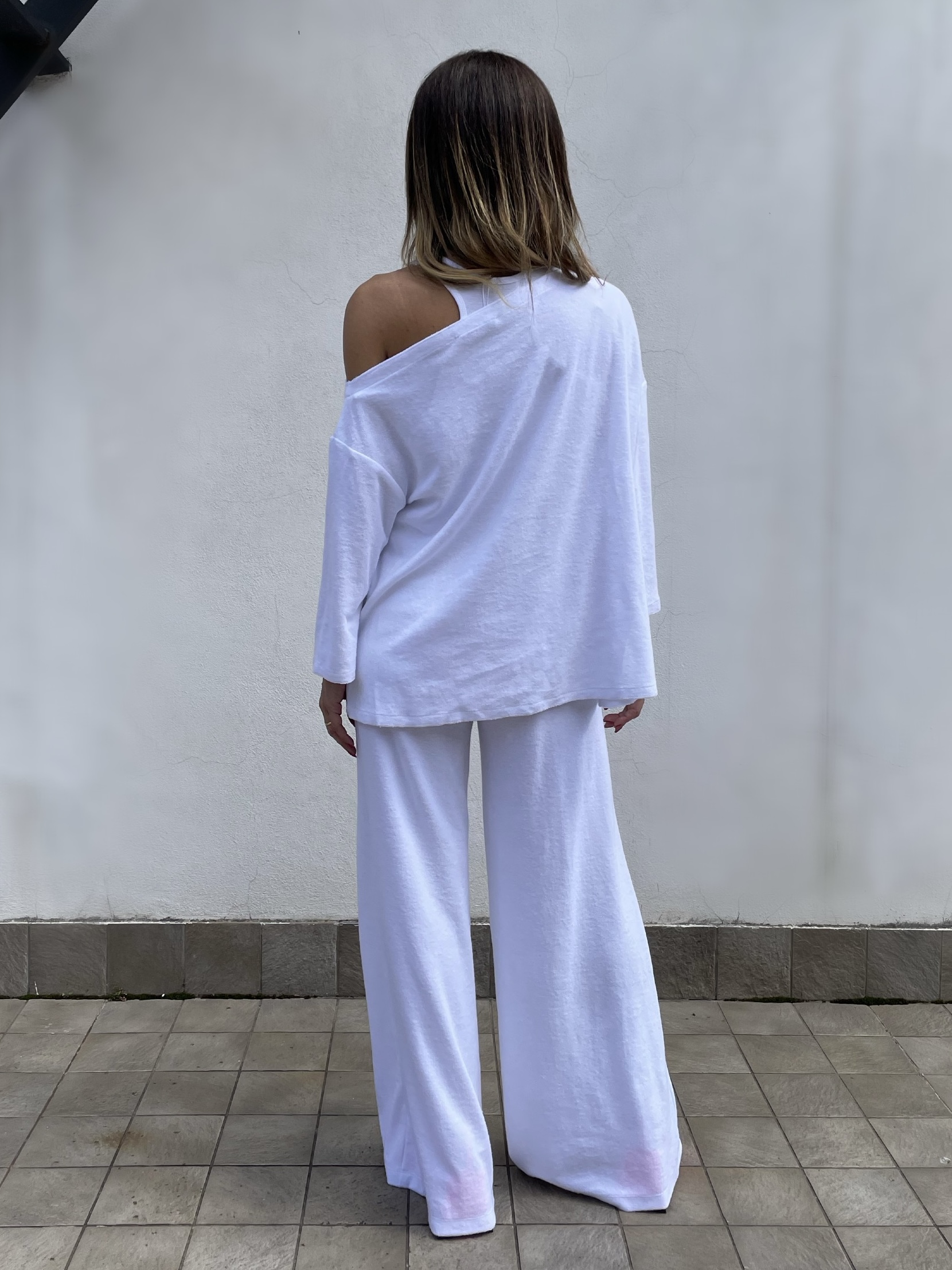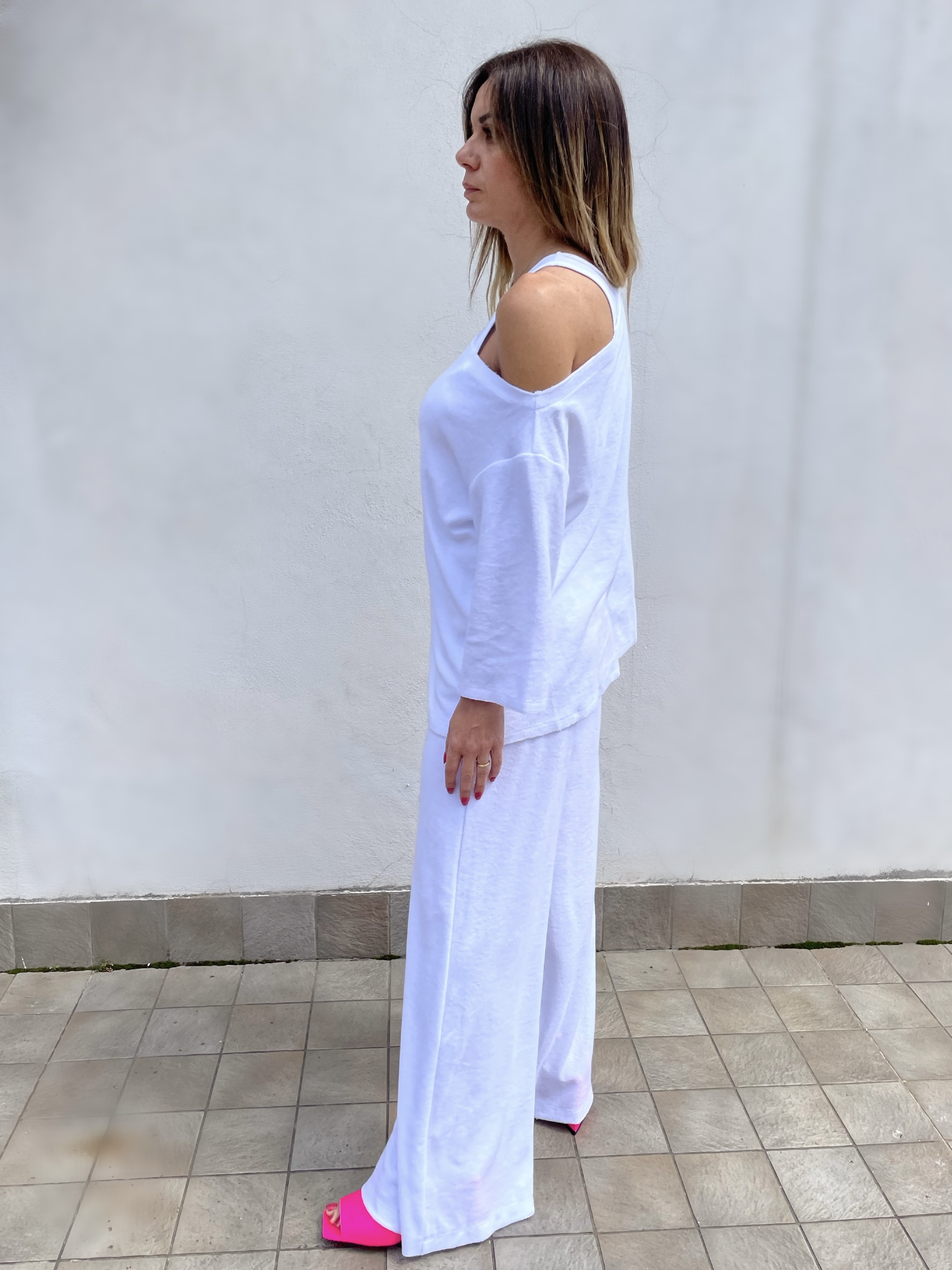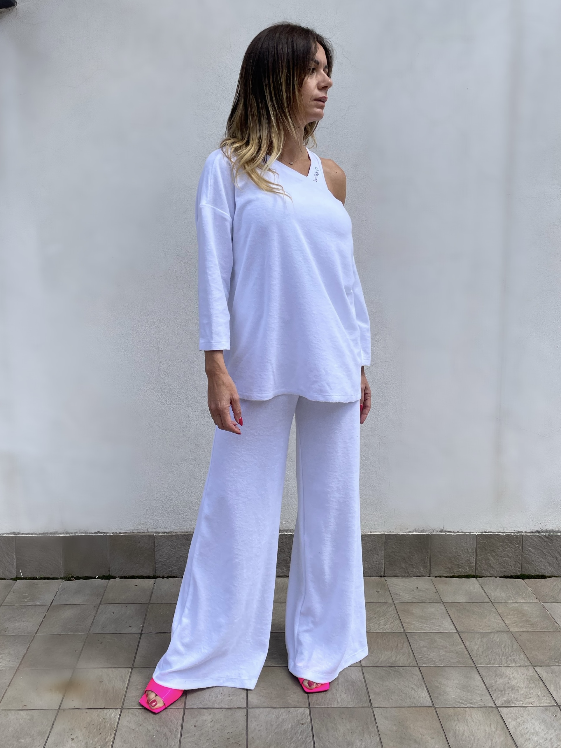 Blusa con scollo asimmetrico in spugna. manica 3/4 con spacchetti.