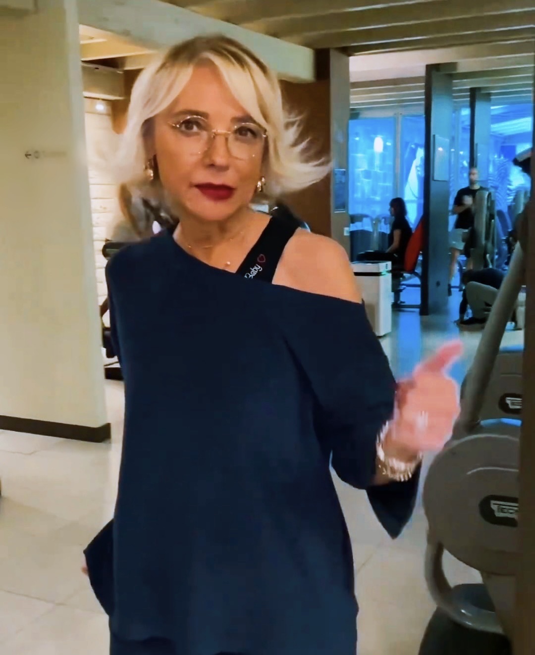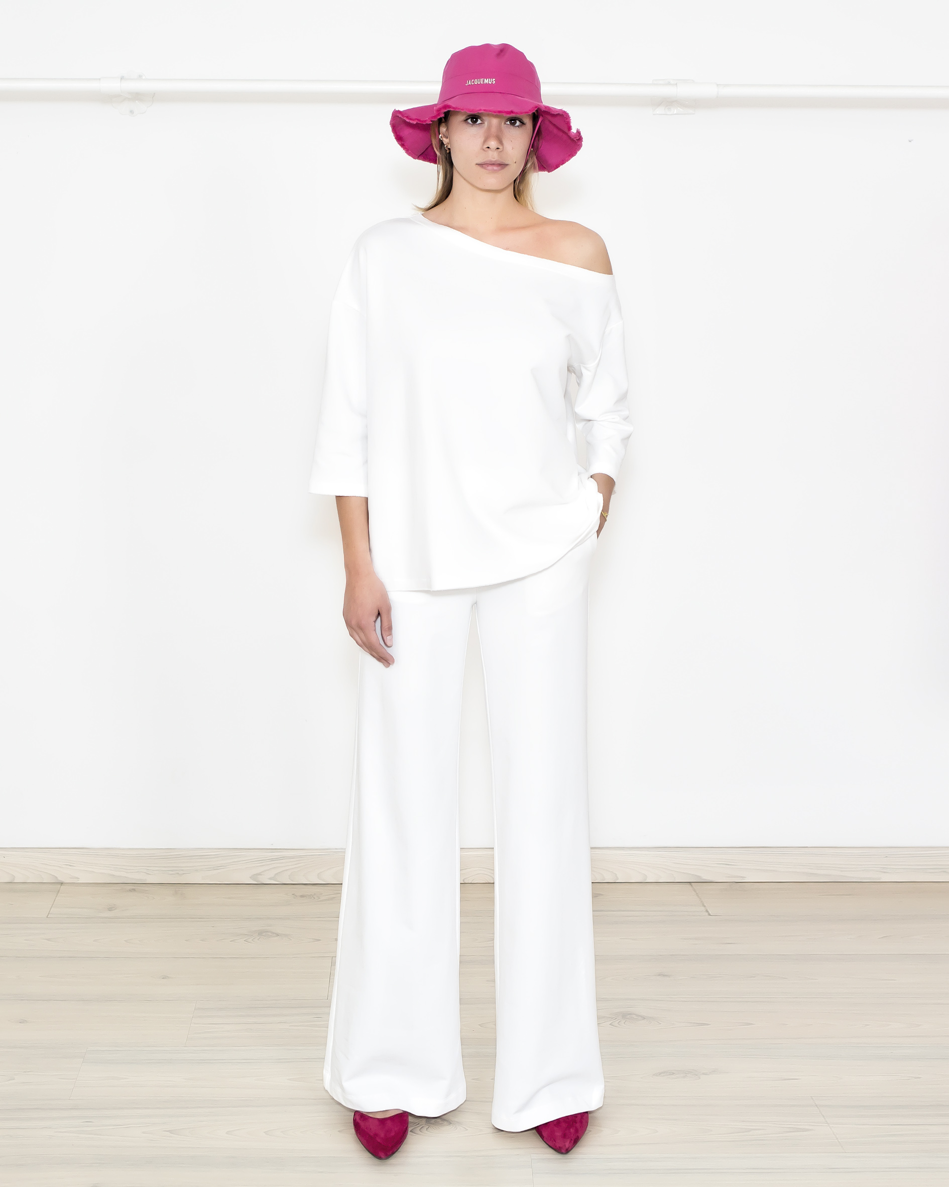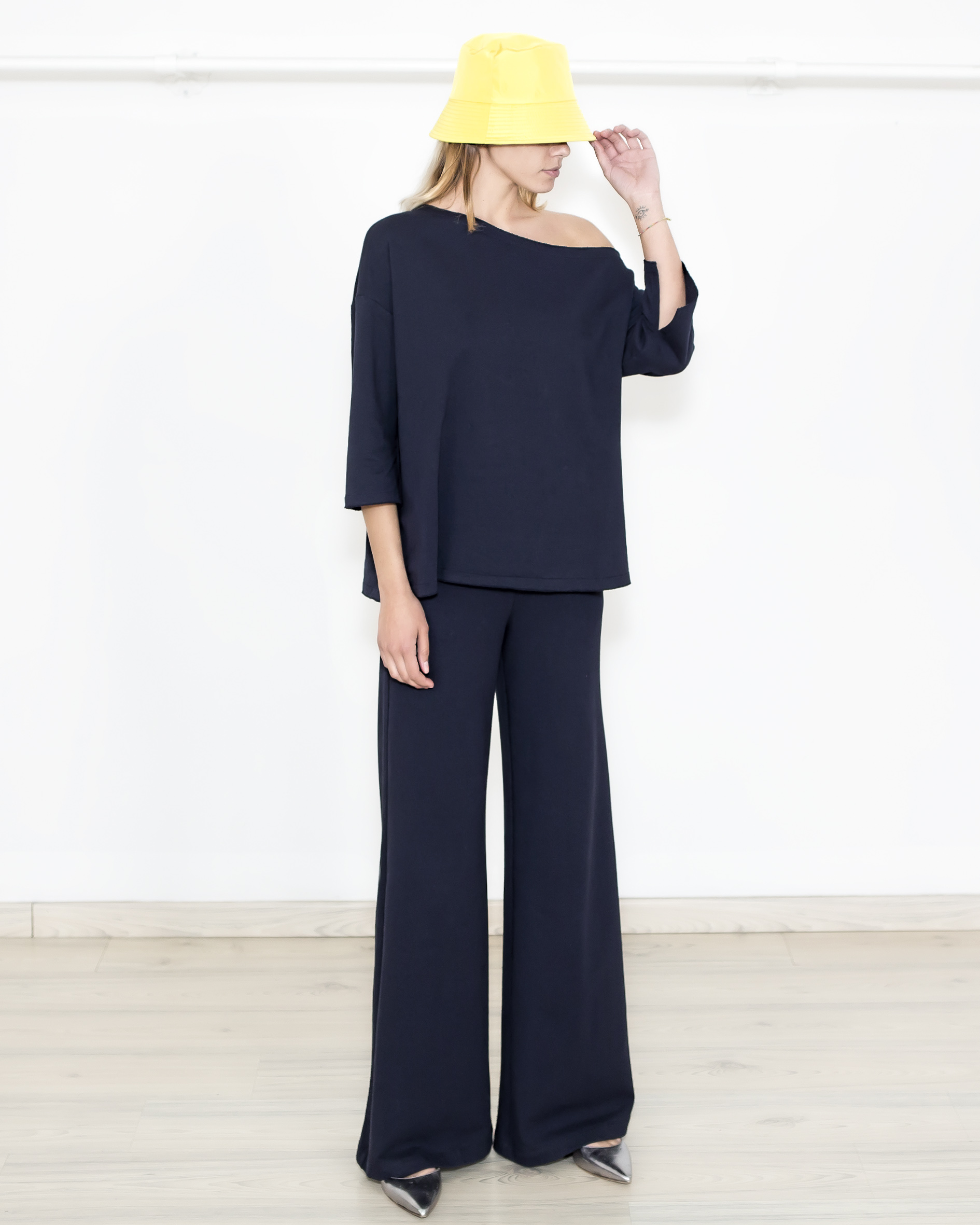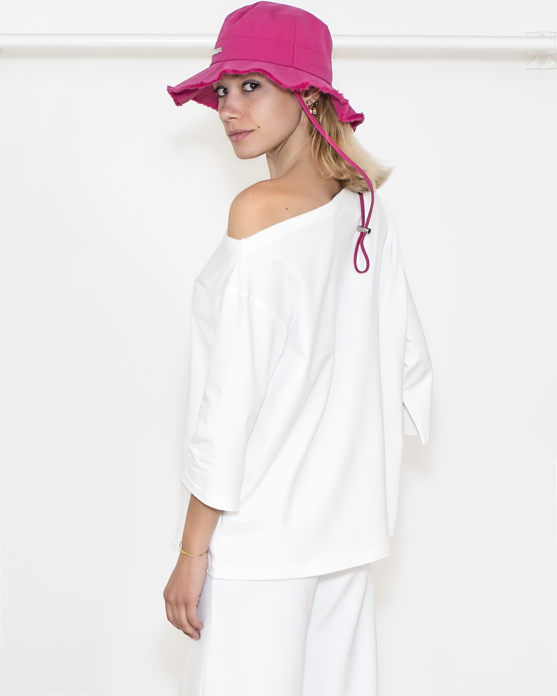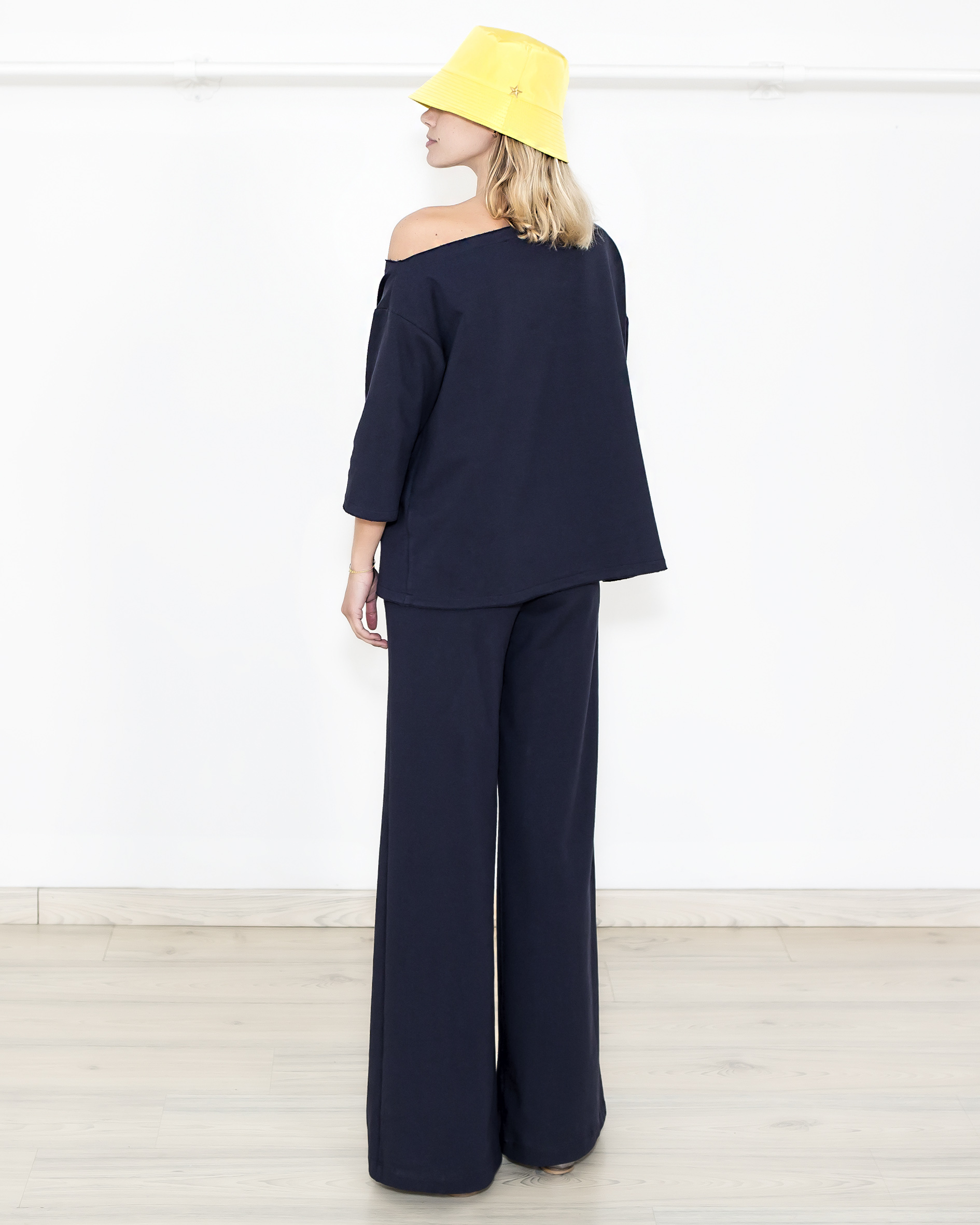 Blusa con scollo asimmetrico in spugna. manica 3/4 con spacchetti.